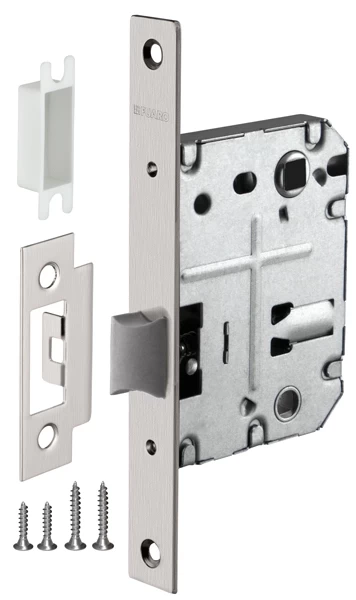 Дверная защелка с пластиковым механизмом Fuaro P72 серии PLASTIC изготовлена в соответствии с требованиями ГОСТ 5089-2003. Предназначена для установки в деревянные межкомнатные двери. Легкая смена направления язычка защелки, подходит для дверей левого и правого открывания. Корпус выполнен из стали с надежным гальваническим покрытием. Ударопрочный пластиковый механизм обеспечивает бесшумность работы защелки. Защелка P72 с усиленным блоком пружин имеет высший 4 класс надежности (250 000 циклов открывания/закрывания). Отверстия под стяжные винты находятся на расстоянии 35-41 мм. Размер бэксета - 50 мм. Размер межосевого расстояния - 70 мм. Возможна установка дверных ручек на стяжные винты для более прочного крепления. Цвет: матовый никель. В комплектацию входят: ответная планка с декоративной вставкой и крепежная фурнитура в цвет изделия.